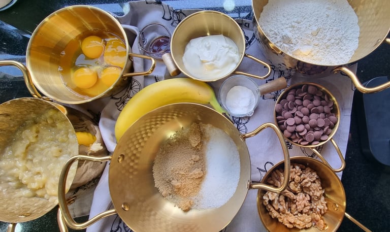 In a bowl mix sugar and eggs, add vanilla, mashed banana and greek yogurt